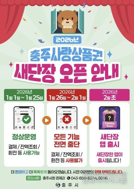 시민행정신문 강갑수 기자 | 충주사랑상품권이 운영대행사 변경에 따라 시스템을 전면 개편하고, 2026년 2월부터 새롭게 재오픈한다.