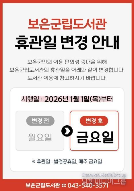 시민행정신문 강갑수 기자 | 보은군립도서관은 2026년 1월부터 정기휴관일을 기존 매주 월요일에서 금요일로 변경해 운영한다고 밝혔다.