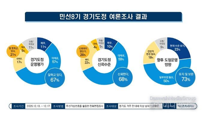 경기도가 여론조사 전문기관 넥스트리서치에 의뢰해 12월 실시한 여론조사 결과, 경기도정 운영을 ‘잘하고 있다’는 응답은 67%로 집계됐다. 이는 동일한 조사 설계로 실시한 9월 61%보다 6%p 상승한 수치다. 반면, 도정 운영을 ‘잘 못하고 있다’는 응답은 21%로 9월 22% 대비 1%p 하락했다.