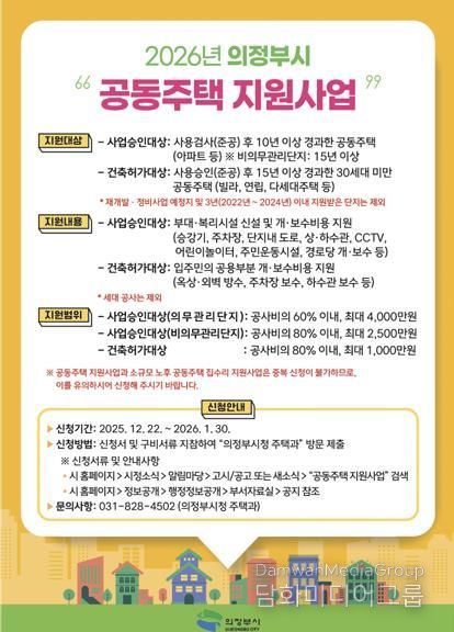 시민행정신문 강갑수 기자 | 의정부시는 노후 공동주택의 관리비용 부담 완화와 주거환경 개선을 위해 내년 1월 30일까지 ‘2026년 공동주택 지원사업’ 신청을 받는다.