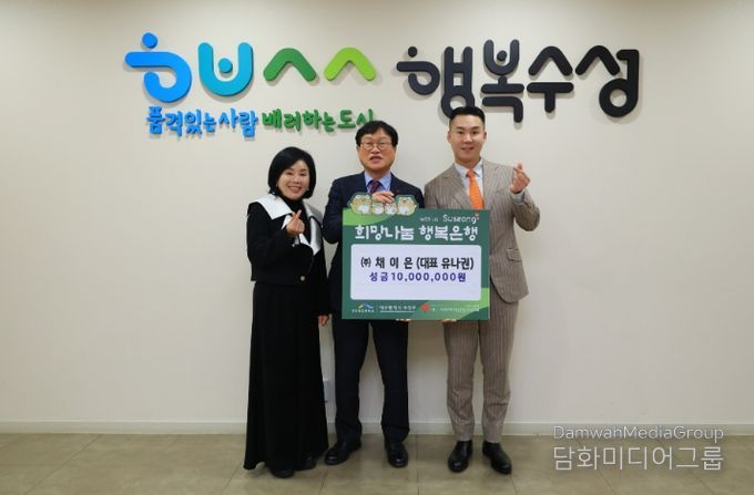 김대권 수성구청장은 “지역기업의 뜻깊은 기부는 지역사회에 큰 귀감이 되며, 다른 기업과 주민들에게도 나눔의 가치를 전하는 계기가 될 것”이라며 “따뜻한 나눔에 깊이 감사드리며, 성금이 우리 주변 이웃들의 삶에 도움이 될 수 있도록 소중히 사용하겠다”고 말했다.