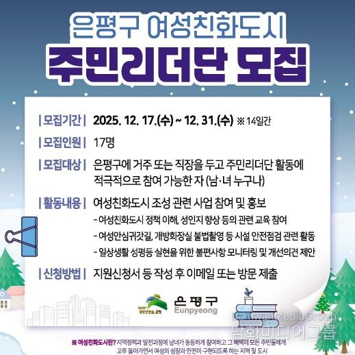 시민행정신문 강갑수 기자 | 서울 은평구는 여성친화도시 조성을 위해 함께 할 ‘여성친화도시 주민리더단’ 단원을 새로 모집한다고 밝혔다.