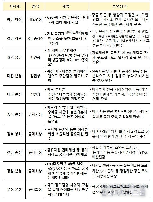 공유재산 경진대회 우수사례로 선정된 10개 지방정부는 다음과 같다.