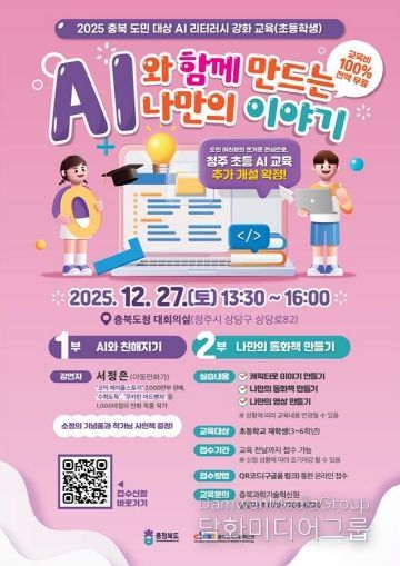 시민행정신문 강갑수 기자 | 충청북도는 오는 12월 27일 13:30 충북도청 대회의실에서 도내 초등학생(3~6학년)과 학부모 200여명을 대상으로 ‘AI 웹툰 교육(중부권 2차)’을 진행한다고 밝혔다. 이번 교육은 북부권(충주), 남부권(옥천), 중부권 1차(청주)에 이어 2025년 마지막으로 개최되는 도내 AI 창작 체험 프로그램이다.
