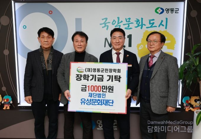 시민행정신문 강갑수 기자 | 충북 영동군은 재단법인 유성문화재단이 22일 오후 영동군청을 방문해 지역 인재 육성을 위한 영동군민장학금 1,000만 원을 기탁했다고 밝혔다.