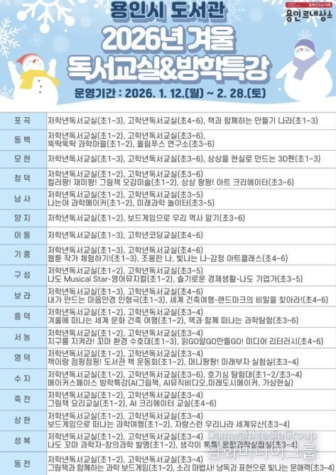 시민행정신문 강갑수 기자 | 용인특례시는 내년 1월 12일부터 2월 28일까지 도서관에서 겨울 독서 교실과 방학 특강을 운영한다고 밝혔다.