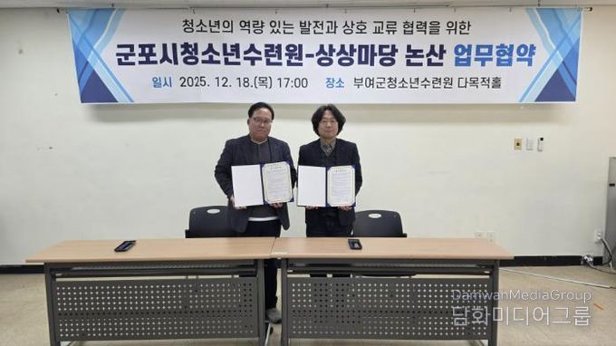 시민행정신문 강갑수 기자 | (재)군포시청소년재단이 운영하는 군포시청소년수련원(충남 청양)과 상상마당 논산은 지난 12월 18일, 지역 청소년의 역량 있는 발전과 문화예술 참여 기회 확대를 위해 상호 교류·협력을 위한 업무협약 체결했다.