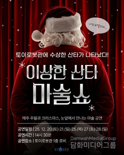 크리스마스 당일에는 ‘이상한 산타 마술쇼’가 펼쳐진다. 겨울 분위기에 어울리는 유쾌한 연출과 관객 참여형 구성으로 아이부터 어른까지 함께 즐길 수 있는 공연으로, 28일 주말까지 이어서 진행된다. 이와 함께 ▲산타와 함께 사진을 남길 수 있는 ‘이상한 산타와 한 컷’ ▲이상한 산타의 ‘선물 보따리’ 이벤트가 운영되며, 선물은 선착순 500명에게 제공되어 크리스마스 방문의 즐거움을 더할 예정이다.