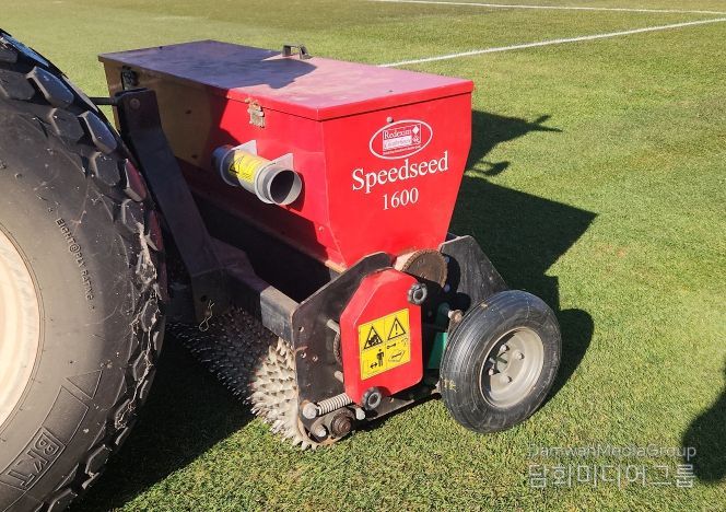 먼저 11월 초 천연잔디 전면에 토양 통기작업을 통하여 토양 내 뿌리 개선을 위한 산소를 공급 후 친환경 미생물 비료를 살포하는 생물학적 공법과