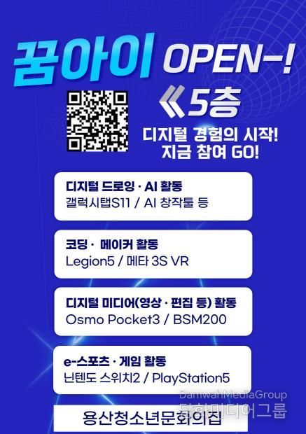 시민행정신문 강갑수 기자 | 서울 용산구는 인공지능(AI)과 디지털 시대를 선도할 미래 인재를 양성하기 위해, 용산꿈나무종합타운(백범로 329) 내 청소년 전용 디지털 공간인 ‘꿈아이 인공지능(AI) 디지털체험실’을 조성하고, 12월부터 시범운영을 시작했다고 밝혔다.