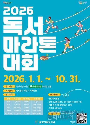 시민행정신문 강갑수 기자 | 광양시립도서관이 지역사회에 독서문화 확산을 위해 2026년 1월 1일부터 10월 31일까지 ‘2026 광양시 독서마라톤 대회’를 운영한다.