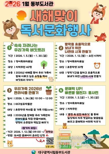 시민행정신문 기자 | 대구동부도서관은 다가오는 새해를 맞아 지역주민이 도서관에서 뜻깊은 한 해를 시작할 수 있도록 1월 한 달간 동부도서관 ‘새해맞이 특별 독서문화행사’를 운영한다.