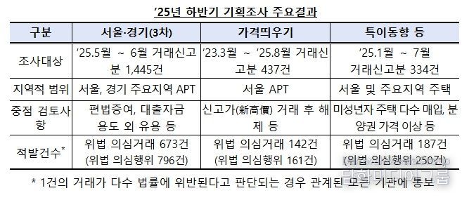 이번 기획조사는▴서울·경기 주택 이상거래(’25.5월~6월 거래신고분),▴부동산 실거래가 띄우기(’23.3월~’25.8월 거래신고분), ▴특이동향 등(’25.1월~7월 거래신고분) 3가지 분야에 대해 실시됐다.