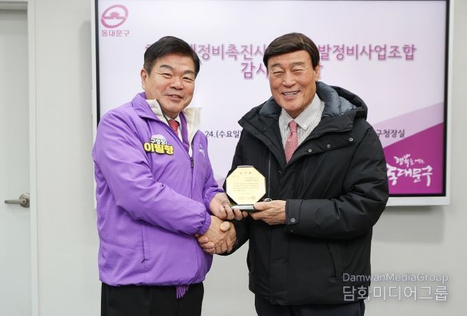 동대문구는 24일 구청장실에서 감사패 수여식을 열고, 휘경3재개발조합을 대표해 이남재 조합장에게 감사패를 전달했다. 행사에는 오선환 상임이사, 김응하 이사, 박종목 감사, 김태동 사무장 등 조합 관계자도 함께했다.