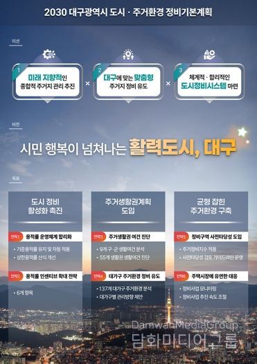 시민행정신문 강갑수 기자 | 대구광역시는 ‘2030 대구 도시·주거환경정비기본계획 변경(안)’을 수립해 도시정비의 미래상과 목표를 설정하고, 이를 실현하기 위한 실천 전략을 제시한다. 본 계획은 주민공람, 시의회 의견청취 등 행정절차를 거쳐 내년 중 확정될 예정이다.