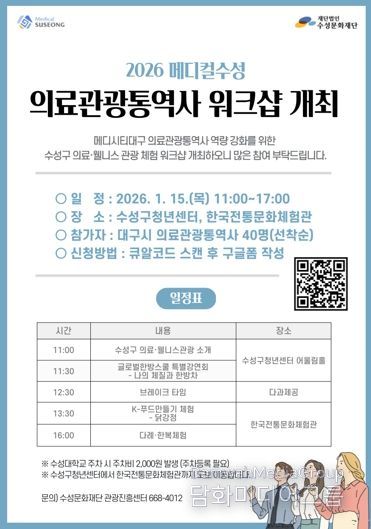 워크숍 참가 신청은 홍보 포스터 내 큐알(QR) 코드 또는 ‘메디컬 수성’ 공식 인스타그램 링크를 통해 가능하다. 문의 사항은 수성문화재단 관광진흥센터로 하면 된다.