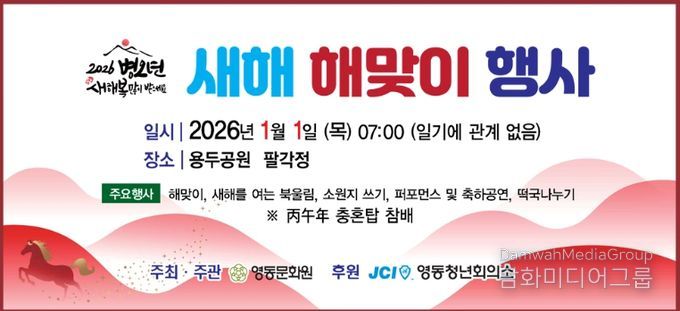 영동문화원 관계자는 “새해 첫날 군민들과 함께 희망의 마음을 모으는 뜻깊은 자리가 될 것”이라며 “앞으로도 지역 문화 활성화와 공동체 화합을 위한 다양한 행사를 지속적으로 추진하겠다”고 밝혔다.
