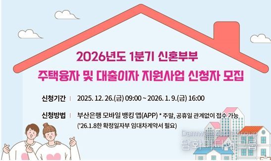 시민행정신문 강갑수 기자 | 부산시는 내년(2026년) 1분기 '신혼부부 주택융자 및 대출이자 지원사업'의 지원 대상자를 오늘(26일)부터 2026년 1월 9일까지 모집한다고 밝혔다.