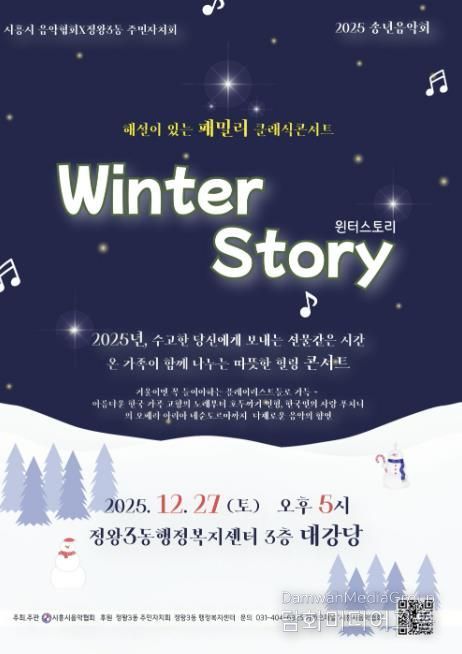 시민행정신문 기자 | 시흥시음악협회는 정왕3동 주민자치회와 협력해 오는 12월 27일 오후 5시, 정왕3동 행정복지센터 3층 대강당에서 2025 송년 음악회 ‘해설이 있는 패밀리 클래식 콘서트, 윈터 스토리’를 개최한다.