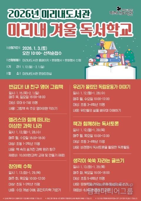 시민행정신문 강갑수 기자 | 원주시 미리내도서관은 오는 1월 유아와 어린이를 대상으로 ‘미리내 겨울 독서학교’를 운영한다.