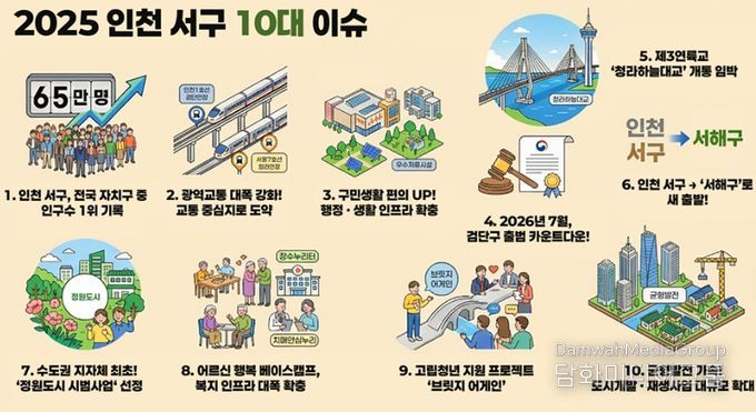 시민행정신문 강갑수 기자 | 인천광역시 서구에서는 2025년 한 해 동안 주요 관심 사항과 정책 추진 상황 등을 정리하여 2025 인천 서구 10대 이슈를 선정·발표했다.