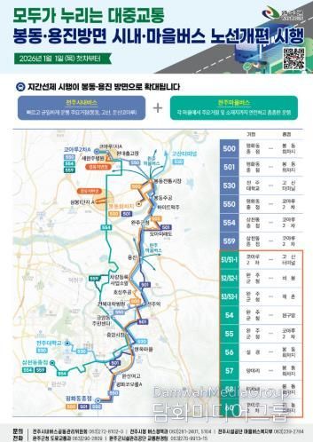 유희태 완주군수는 “봉동·용진 지역에 마을버스가 본격 도입되면서 친절도 향상과 맞춤형 시간표 운영, 정시성 확보, 교통비 절감 등 다양한 긍정적 효과가 나타날 것”이라며, “앞으로도 군민들의 대중교통 이용 편의를 높이기 위해 지속적으로 개선해 나가겠다”고 말했다.