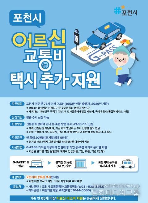 지원 대상은 포천시에 주소를 둔 만 75세 이상 어르신(1952년 이전 출생자)으로, 기존 우대형 교통카드(G-PASS) 발급자는 별도의 신청 없이 혜택을 이용할 수 있다.