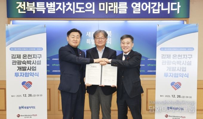 시민행정신문 이세훈 기자 | 전북특별자치도가 26일 도청 회의실에서 김제시, 베스트웨스턴플러스 김제호텔과 김제 온천지구 관광숙박시설 개발사업 투자협약(MOU)을 체결했다.