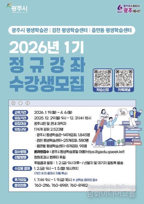 시민행정신문 강갑수 기자 | 광주시는 12월 29일부터 31일까지 평생학습관, 검천평생학습센터 및 읍면동 평생학습센터에서 운영하는 2026년 제1기 평생학습 프로그램 수강생을 모집한다고 26일 밝혔다.