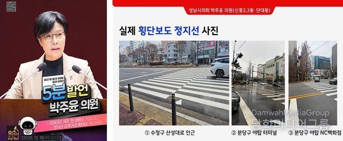 박 의원은 이날 수정구 산성대로와 분당구 야탑동 횡단보도 현장 사진을 직접 공개하며, “정지선을 지켜도 보행자와의 안전 거리가 전혀 확보되지 않는 실정”이라고 강조했다. 그는 “이곳을 매일 아이들과 어르신, 시민들이 건너고 있다”며, “지금 이 거리 그대로 괜찮은지 우리 모두가 답해야 할 문제”라고 말했다.