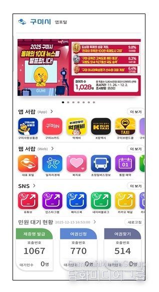 구미시 관계자는 “모바일 앱포털 구축으로 시에서 운영 중인 다양한 앱과 웹 서비스를 체계적으로 관리하고, 시민들이 필요한 정보를 보다 빠르게 찾을 수 있는 환경을 마련했다”며 “앞으로도 시민 중심의 스마트 행정 서비스를 지속적으로 개선해 나가겠다”고 말했다.