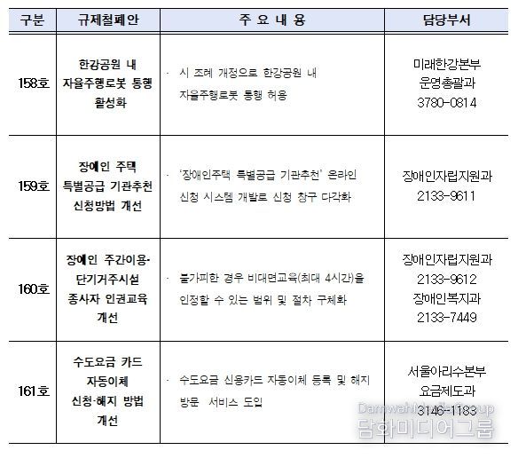 서울시는 내년 상반기 중으로 ▴한강공원 자율주행로봇 통행 허용(158호) ▴장애인주택 특별공급 기관추천 신청방법 개선(159호) ▴장애인시설 종사자 인권교육 개선(160호) ▴수도요금 카드 자동이체 개선(161호), 총 4건의 규제를 개선하겠다고 밝혔다.