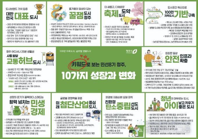 이범석 청주시장은 “민선8기 3년 6개월은 청주시가 역대 최대 규모의 투자 유치와 대규모 국책사업을 통해 도시가 빠르게 성장함과 동시에 시민들이 체감할 수 있는 꿀잼·복지 인프라를 대폭 확충한 ‘성장과 변화’의 시기였다”고 말했다.