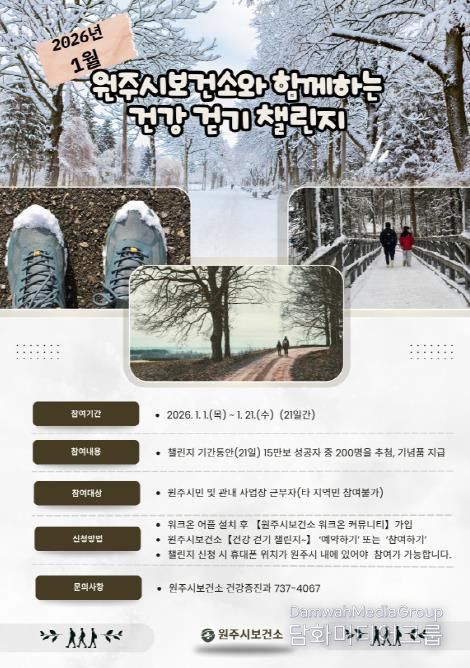 시민행정신문 기자 | 원주시보건소는 새해를 맞아 보건소와 함께하는 1월 건강 걷기 챌린지를 운영한다.