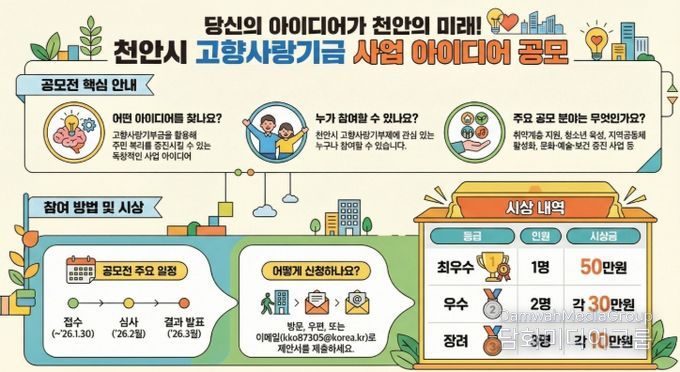 시민행정신문 강갑수 기자 | 천안시가 고향사랑기부제 기금사업 아이디어 공모전을 실시한다고 29일 밝혔다.