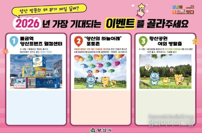 양산시 관계자는 “2026 양산방문의 해는 행정이 일방적으로 만드는 관광이 아니라, 시민과 함께 만들어가는 관광도시 프로젝트”라며 “이번 시민 참여 이벤트를 통해 시민들이 기대하는 관광 콘텐츠를 직접 확인하고, 이를 실제 사업으로 구체화해 나가겠다”고 밝혔다.