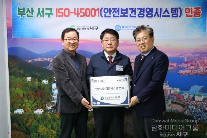 시민행정신문 강갑수 기자 | 부산 서구는 국제 인증 심사기관인 KSR인증원으로부터 국제 표준 안전보건경영시스템(ISO45001) 인증을 획득해 지난 29일 오후 2시 30분 인증서 수여식을 가졌다.