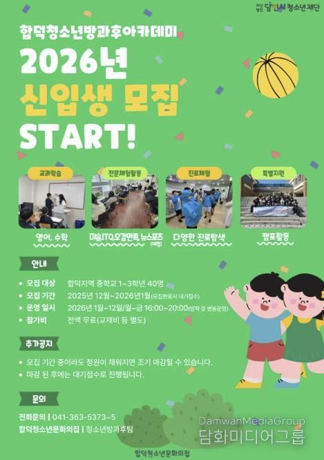 합덕청소년방과후아카데미 관계자는 “단순 돌봄을 넘어 청소년의 학습, 진로, 인성을 종합적으로 지원하는 질 높은 프로그램을 운영하겠다”며 “매년 조기 마감 사례가 있는 만큼 관심 있는 가정의 빠른 문의를 바란다”고 전했다.