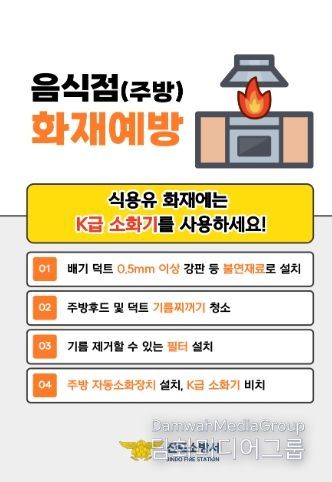 김재출 진도소방서장은 “주방 후드나 덕트에 기름때가 축적된 경우 작은 불씨도 대형 화재로 이어질 수 있다”며 “정기적인 청소와 함께 K급 소화기 비치 및 주방용 자동소화장치 설치 등 화재 예방 수칙을 철저히 지켜달라”고 말했다.