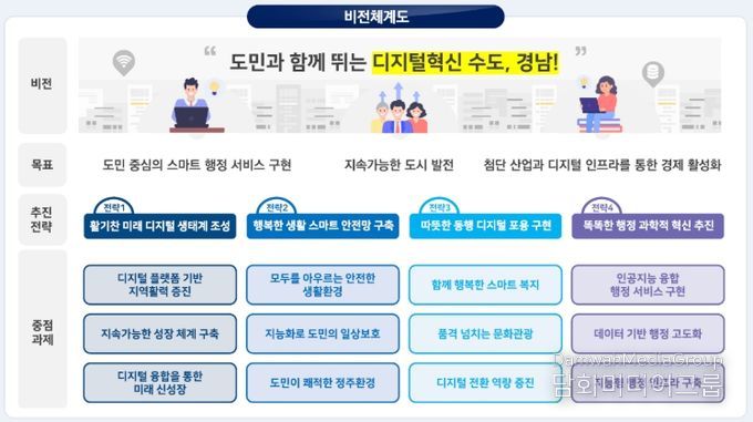 경남도는 ‘도민과 함께 뛰는 디지털혁신 수도, 경남!’을 비전으로 설정하고, 이를 실현하기 위한 4대 추진 전략으로 활기찬 미래 디지털 생태계 조성, 행복한 생활 스마트 안전망 구축, 따뜻한 동행 디지털 포용 구현, 똑똑한 행정 과학적 혁신 추진을 제시했다.