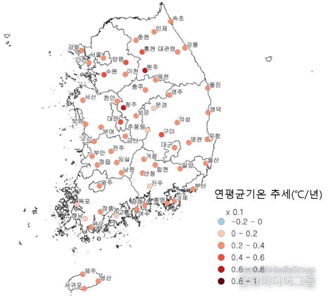 기후변화 특성의 지역별 차이를 상세히 살펴보기 위해, 최근 52년(1973∼2024년) 기후변화 추세의 공간적인 분포 특성을 분석했다. 평균기온과 최저기온은 다른 지역에 비해 경기남부, 강원영서, 충청내륙 등 중부내륙을 중심으로 큰 상승 추세가 나타났고, 최고기온은 전국적으로 상승 추세가 나타났다.