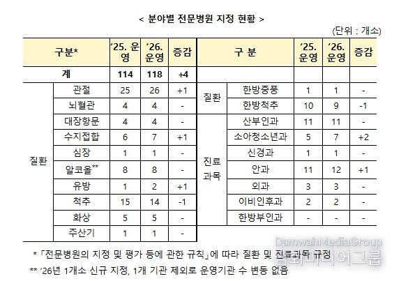 제5기 3차년도 전문병원 지정에 따라, 2025년 114개에서 2026년에는 118개 전문병원을 지정·운영하게 된다.