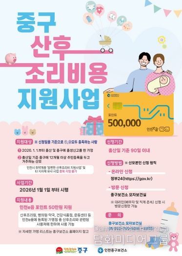 시민행정신문 강갑수 기자 | 인천시 중구는 출산 가정의 경제적 부담을 덜어주기 위해 새해인 오는 2026년 1월 1일부터 ‘중구 산후조리비 지원 사업’을 본격적으로 시작한다고 밝혔다.