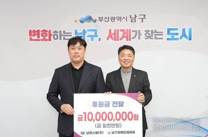 시민행정신문 강갑수 기자 | 남경스틸(주)(대표 문상혁)가 지난 12월 30일, 부산 남구장애인체육회에 장애인체육 성화를 위한 기부금 1천만 원을 전달했다고 밝혔다.