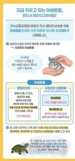 이에 따라 야생동물(포유류·조류·파충류·양서류) 관련 4개 업종(판매업·수입업·생산업·위탁관리업)은 지자체로부터 영업허가를 받아야 하며, 개인적으로 야생동물을 기르는 주민은 보관·폐사 등에 대해 신고해야 한다.