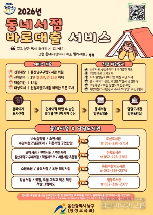 시민행정신문 강갑수 기자 | 울산 남구는 2026년 ‘동네서점 바로대출’서비스를 2일부터 운영한다.