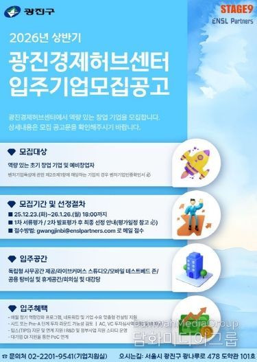 신청 기간은 2026년 1월 26일까지다. 광진구청 또는 엔슬파트너스 누리집에 게시된 서식에 따라 제출 서류를 준비해 이메일(gwangjinbi@enslpartners.com)로 접수하면 된다. 구는 기술성, 시장성, 사업성 등에 대한 평가와 심사를 거쳐 입주기업을 최종 선정하고 개별 안내할 예정이다. 자세한 사항은 광진경제허브센터 기업지원실(02-2201-9541)로 문의하면 된다.