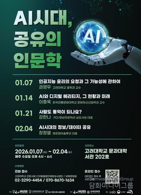 이번 시민강좌는 고려대학교 인문사회 디지털융합인재양성사업단(HUSS사업단)과 고려대 디지털인문융합연구원, KU인문사회AI협의회가 공동 주최하고, 성북문화원과 HUSS사업단이 주관한다. 성북구청과 교육부, 한국연구재단이 후원하며, AI 시대의 미래를 시민과 함께 사유하기 위해 마련됐다.