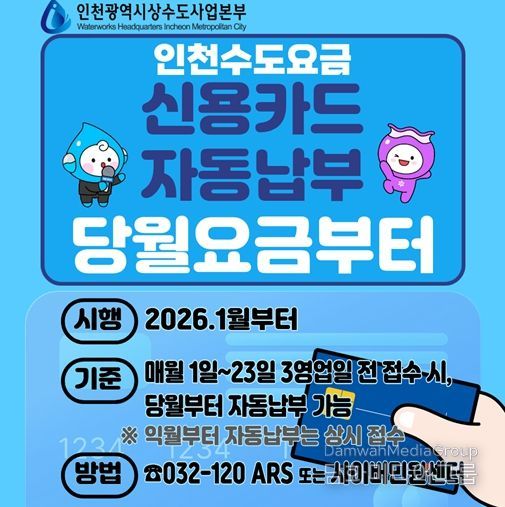 시민행정신문 강갑수 기자 | 인천광역시 상수도사업본부는 시민 편의 중심의 수도요금 납부 환경을 조성하기 위해, 신용카드 자동납부를 신청한 달부터 바로 적용할 수 있도록 제도를 개선해 시행했다고 1월 2일 밝혔다.