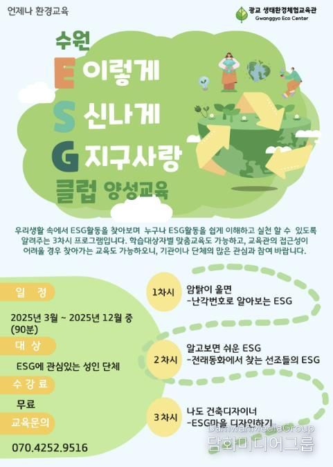 수원 환경·사회·지배구조(ESG) 클럽 양성교육은 청소년과 시민을 대상으로 ‘환경 보호와 사회적 책임, 지속가능한 삶의 방식’을 주제로 운영되는 교육과정이다. 참여자들이 체험 중심의 활동을 하며 환경·사회·지배구조(ESG) 개념을 이해하고, 일상 속 실천 방안을 모색하는 교육들로 구성됐다.